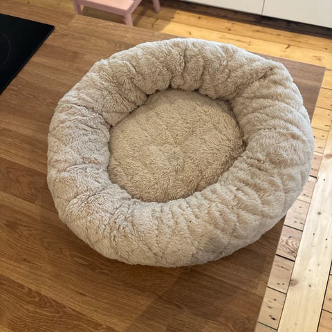 Hyggelig katte- eller hundeseng fra ZooPlus af mærket "Cozy Cord". Vamset og blødt plys indvendigt, med høj kant og sænket indgang. Mørkegråt, fløjlslignende stof udvendigt. Skridsikker bund.