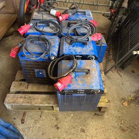 Elektrisk varmeblæser med effekt på 9 kW til 400V tilslutning. Enheden har frontgitter og betjeningsknapper øverst til regulering af varme og blæserfunktion.