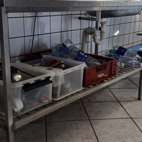 Rustfri stål bord med vask og hylder