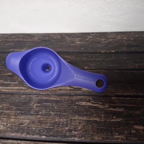 Tupperware tragt med si i lyseblå plast. Tragten har indbygget si med små huller, som gør den egnet til at filtrere væsker eller skylle mindre mængder madvarer. Langt håndtag giver godt greb ved hældning. Velegnet til brug i køkkenet til fx påfyldning af flasker eller sigtning direkte ned i beholdere.