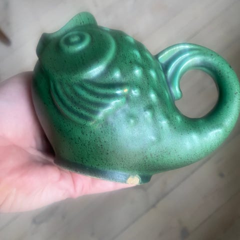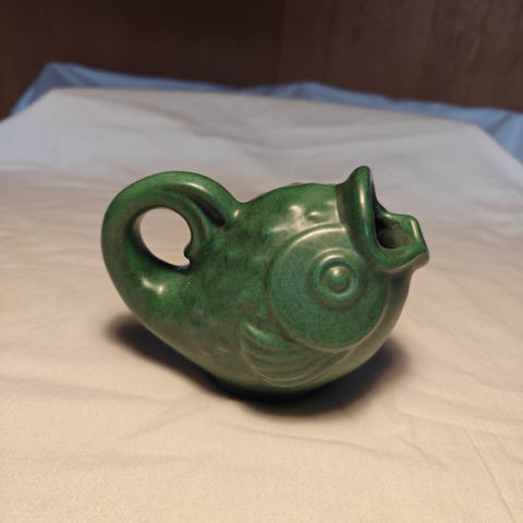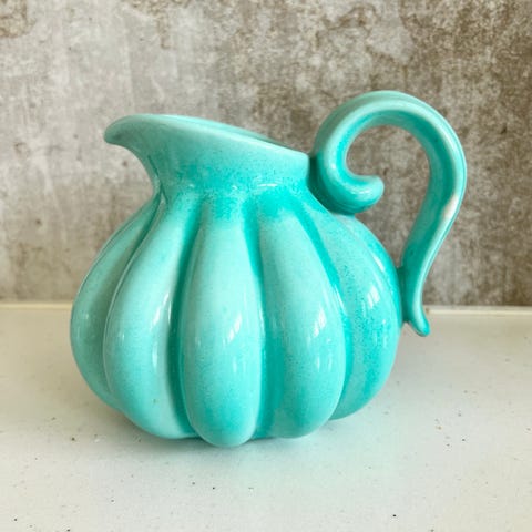Kande i grøn keramik med markerede, buede sider og integreret hank. Organisk, rund form med hældetud. Kan bruges som kande til servering, men jeg har brugt den som blomstervase.