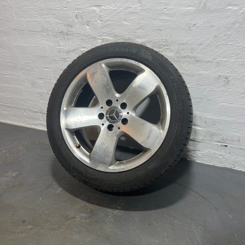 Mercedes dæk med fælg i sølvfarvet design. Fælgen har 5 eger og er forsynet med Mercedes-logo i midten. Velegnet som komplet hjul til personbil, for eksempel som ekstra hjul eller erstatning for eksisterende hjul. Størrelse, dækdimension og boltafstand fremgår ikke og bør kontrolleres på selve hjulet eller ved kontakt med sælger.