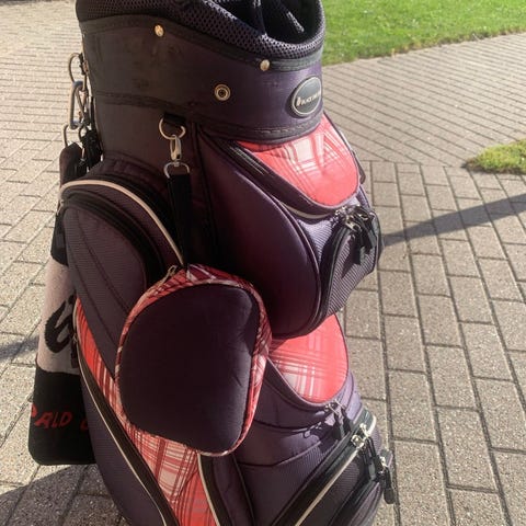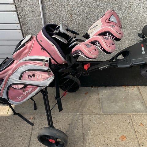 Golfsæt Dame. Højre hånd. Spalding sæt bestående af 3 køller, 6 jern og putter. Bag og vogn medfølger. Brugt 1 sæson.