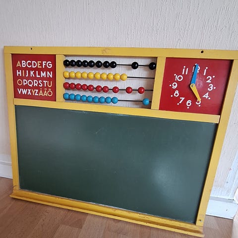 Kridttavle med Anders And og Mickey Mouse. Børnene kan lære klokken på et analogt ur og tælle på "kuglerammen"