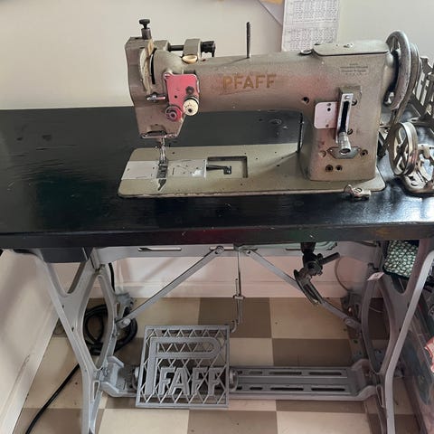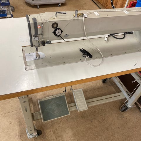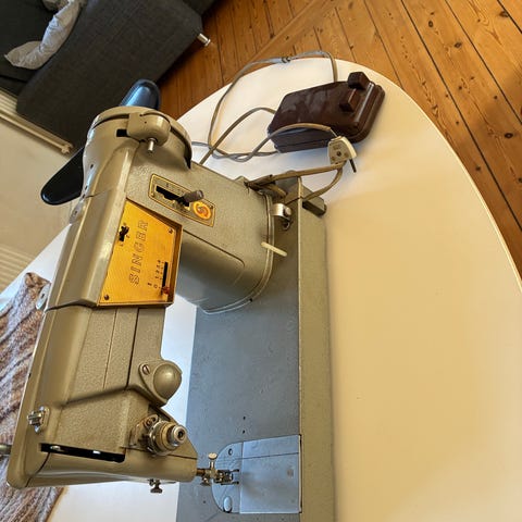 Industriel symaskine monteret på stabilt metalbord med bordplade. Maskinen drives af underbygget motor og betjenes via fodpedaler. På bordet medfølger forskellige trådruller og tilbehør, som ses på billederne. Velegnet til industrielt eller værkstedsbrug, f.eks. til syning af kraftigere materialer afhængigt af maskinens opsætning og nålevalg. Maskinen fremstår som en ældre, robust model med mekanisk betjening.højde 75,5 cm. Bredde 80 cm. Dybde 52 cm. Maskinen produceret af Aalbook