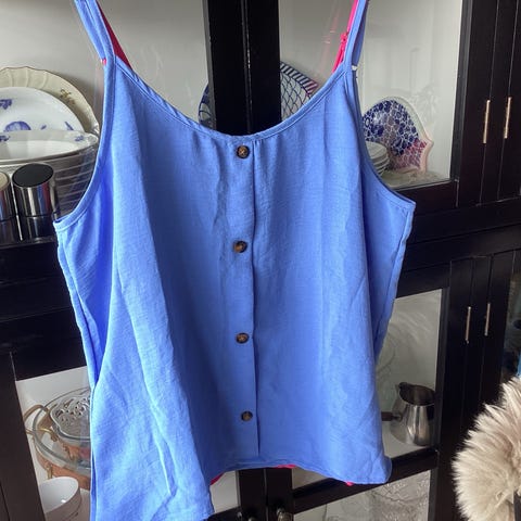 Shein top til dame i størrelse XXL. Ærmeløs model i blå polyester med v-udskæring og knapdetalje foran. Længere pasform, som kan bruges over bukser, leggings eller nederdel. Velegnet til hverdagsbrug eller som let lag over andre basisdele.