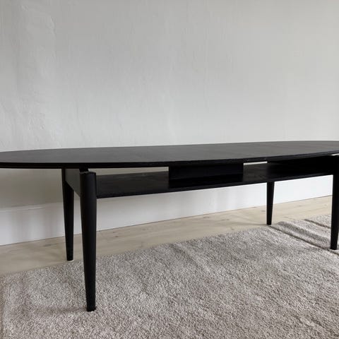 Flot ovalt sofabord i sort med solid fod. Enkelt og stilrent design, der passer til de fleste hjem. Også i god stand med almindelige brugsspor.