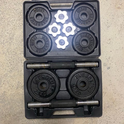 Håndvægtsæt bestående af vægtstang(e), krom vægtskiver og lukkemøtrikker samlet i en hård plastkuffert. Sættet er egnet til styrketræning i hjemmet, hvor vægtene kan justeres ved at tilføje eller fjerne skiver. Kufferten gør det muligt at opbevare og transportere sættet samlet og beskyttet.
