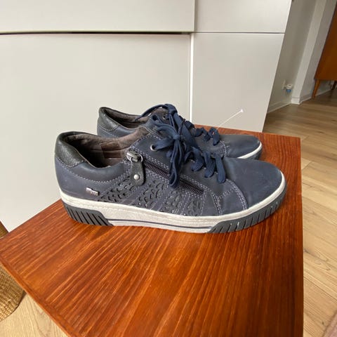 Rieker sneakers i størrelse 45. Skoene er sorte med lyse snørebånd og kontrastsyninger samt lynlåsdetalje i siden. Lav model, velegnet som hverdagssko. Materiale fremstår som syntetisk/læderlook med tekstilfor. Neutral stil, der kan bruges til både jeans og andre afslappede outfits.