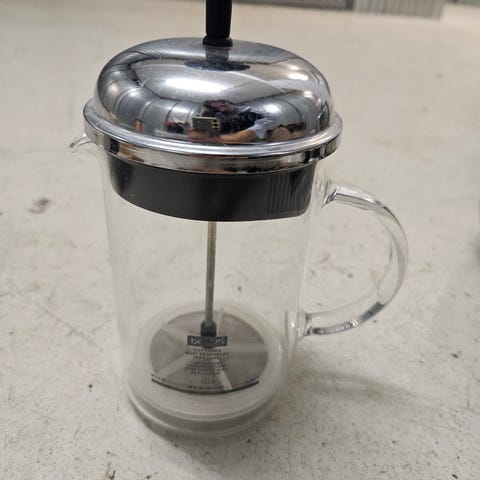 Bodum stempelkande i glas med metal- og plastdele. Kanden har cylindrisk form med glasbeholder og aftageligt låg med stempel og filter. Velegnet til brygning af kaffe eller te ved hjælp af stempelmetoden. Kanden har måleangivelser på siden og er egnet til brug i køkkenet til daglig brygning af varme drikke.