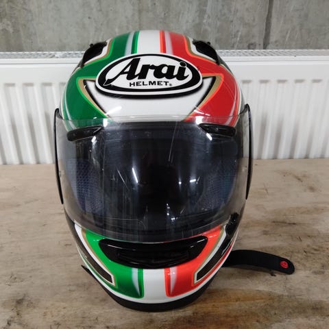 Hjelmen er i pæn og i let brugt stand med almindelige brugsspor og mindre ridser. Visiret fungerer som det skal, og hjelmen har regulerbar luftåbning i toppen, som giver bedre ventilation på varme dage og længere ture. Virkelig flot og ren som ny indvendig.
