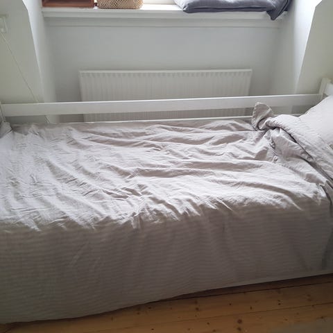 Børneseng enkeltseng i hvidt trælook. Sengen er velegnet til ét barn og har sengehest ved hovedenden. Klassisk, enkel udformning som passer ind på de fleste børneværelser. Madras- og sengetøjsmål fremgår ikke præcist af annoncen, men sengen er i standard enkeltsengsstørrelse til børn.
