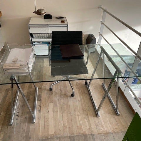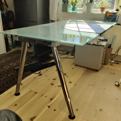 Rigtig fint glasbord, modellen med de forkromede justerbare ben. Med skriveunderlag.
