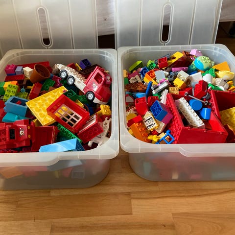 En kasse med masser af blandet DUPLO.