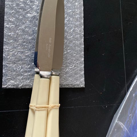 23 cm lange. 12 stk Raadvad knive, sandsynligvis spise- eller bordknive, med lyse plast- eller bakelithåndtag. Bladene er i metal og stemplet med Raadvad og kronemærke. Egnet som bestik til borddækning eller som supplement til eksisterende Raadvad-bestik. Antal knive fremgår af billederne.