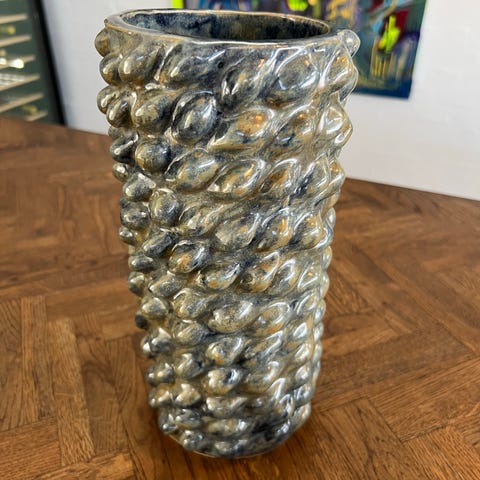MADS BANG SIMONSEN har designet denne fantastiske cylinderformet vase med markant rillet og knopret overfladestruktur. Vasen har en unik blank glasur i grøn-/blålige nuancer.