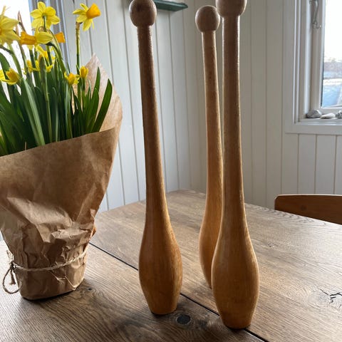 To træ køller egnet til udendørs leg eller spil. Begge køller er fremstillet i lyst træ, den ene med to røde markeringer øverst på skaftet. Formen er rund med let tilspidset greb i den ene ende. Kan anvendes til forskellige lege- og havespil eller som rekvisitter til træningsøvelser. Sælges samlet som vist på billederne.