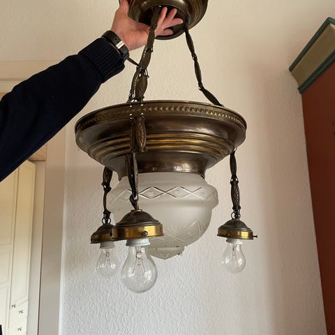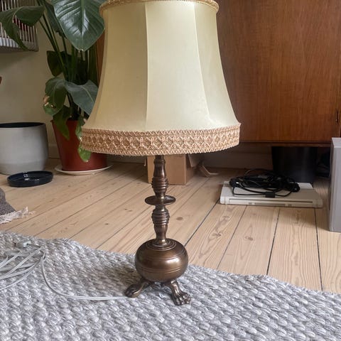 Antik lampe på løvefødder med skærm “ ikke rengjort “ 250 kr “49 cm høj