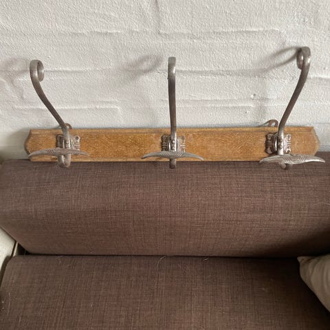 klassisk knagerække med messingknager og en massiv træplade.