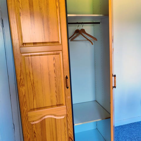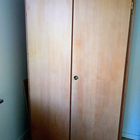 Rummeligt klædeskab med smukke teaktræslåger. De originale messingbøjlestænger medfølger. I højre side er indsat hylder, men de kan tages ud, hvis køber ønsker at have bøjlestang i stedet. Skabet kan adskilles til transport. Køber transporterer.