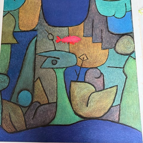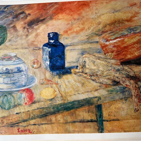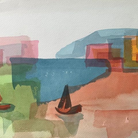 André Derain kunstplakat med farverigt strand- og havnemotiv. Motivet viser både, strand og figurer i stærke, klare farver i fauvistisk stil. Nederst på plakaten ses tryk med kunstnernavn og oplysninger om ophavsret samt tryksted i Schweiz fra 1960.