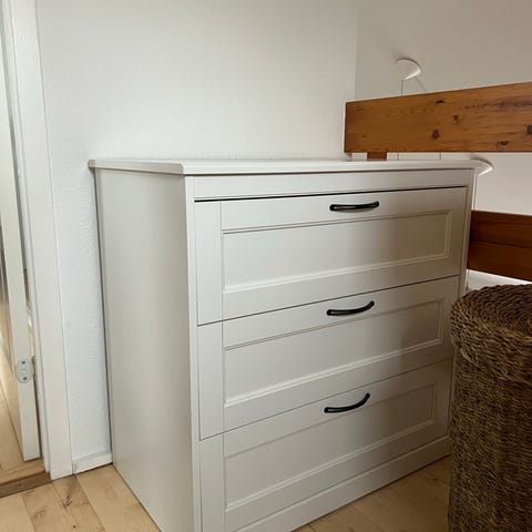 Den har massere af plads dog er den nederste skuffe lidt i stykker men den kan stadig åbnes og har ikke slev oplevet problemer med skuffen