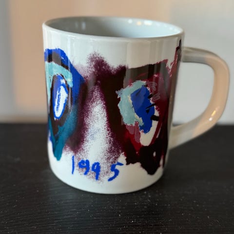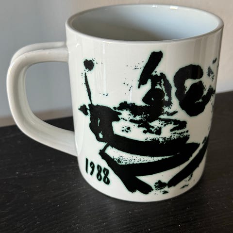 Royal Copenhagen fajance krus i hvid med sort, abstrakt dekoration. Kruset er udført i fajance og har hank. Bunden er stemplet med Royal Copenhagen-mærke og angivelse af fajance. Årgang 1988.