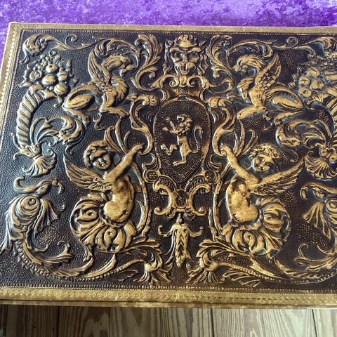 med dragemotiv og dekorative blomster- og mønsterborter på siderne.