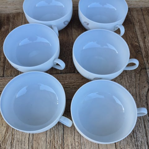 Royal Copenhagen kopper i hvidt porcelæn med mørk kant langs kanten. Klassisk form med hank, velegnet til servering af varme drikke som kaffe, te eller kakao. 6 stk