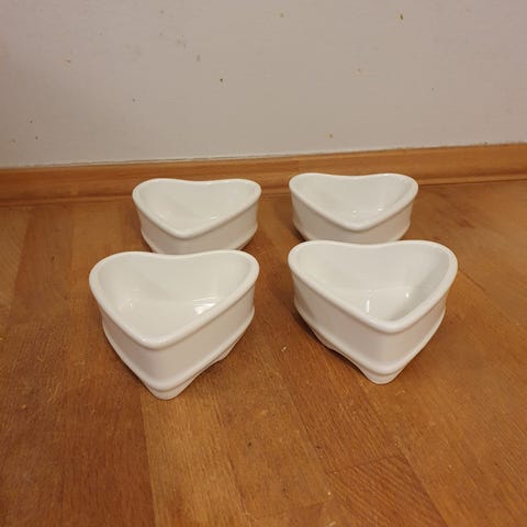 Porcelæn, Hjerteskåle, Fire ovnfaste skåle i hjerteform. De er med hvid glasur. Tre af dem er forhøjet i kanten (6,5 cm.) og den sidste (det lidt større hjerte) er lavere i kanten (3,5 cm.)