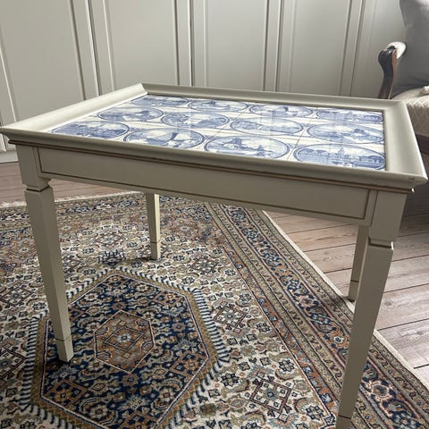 Hvidmalet ældre sofabord eller pyntebord. Toppen er lavet om til dette fine mønster og så har jeg fået speciallavet en glasplade dertil.