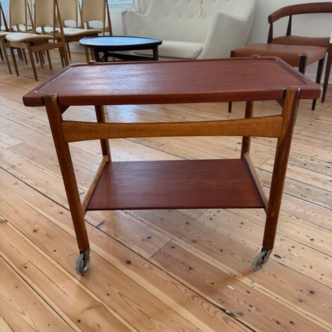 Smukt retro rullebord med 3 hylder og hjul i massivt teak. Perfekt som barvogn, plantebord, sengebord, sofabord eller lille sidebord i stuen. Flot varm træfarve og elegant skandinavisk design.