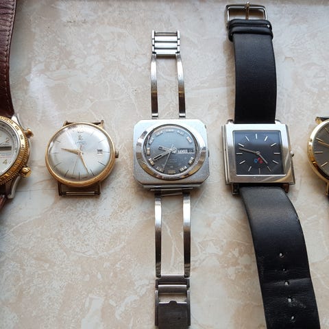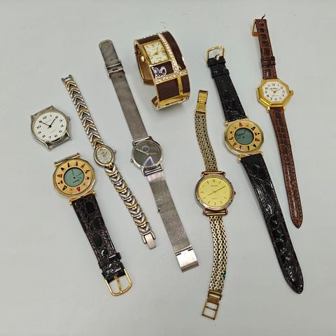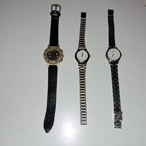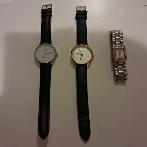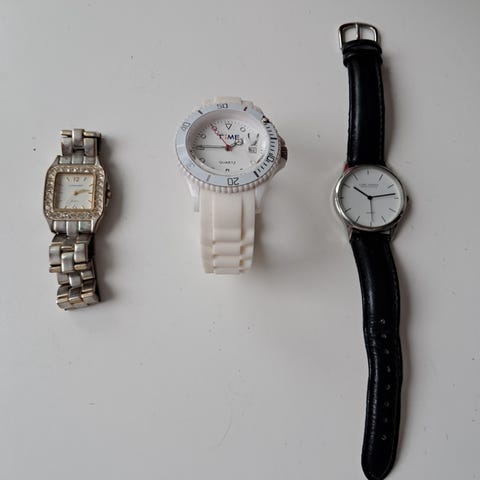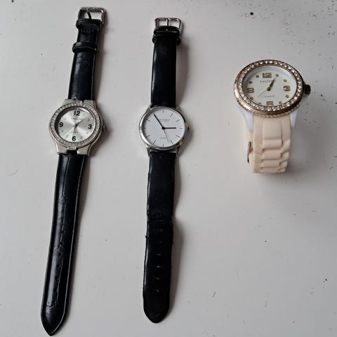 3 brugte Quartz armbåndsure i god stand. Mærker bl.a. Geneva og London samt ét med ukendt mærke.