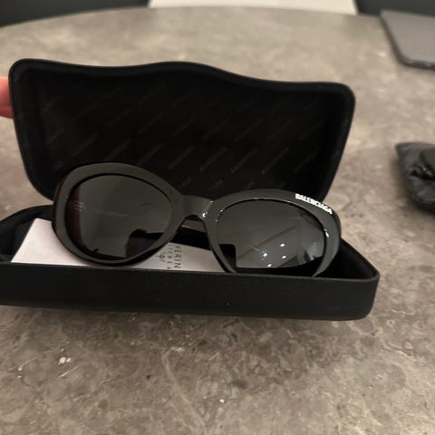 Balenciaga solbriller til kvinde i sort. Modellen har firkantede stel med mørke glas og detaljer i guld ved stængerne. Leveres med Balenciaga-etui og æske, som ses på billederne.