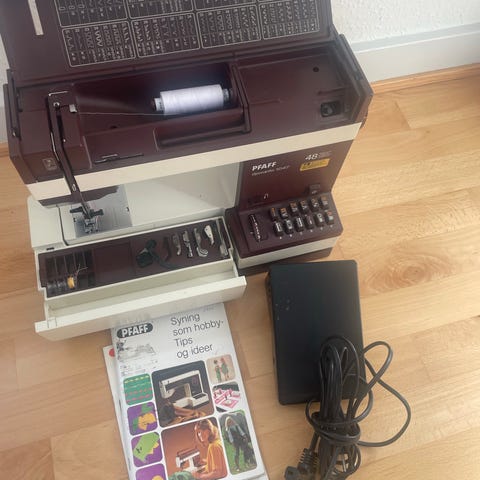 Pfaff 1526 Select symaskine i hvid. Maskinen fanger ikke tråden, noget med spolehuset eller selve spolen. Jeg ved det faktisk ikke. Jeg har prøvet men jeg tror jeg mangler et eller andet. Ingen tilbehør andet end det der er på billederne