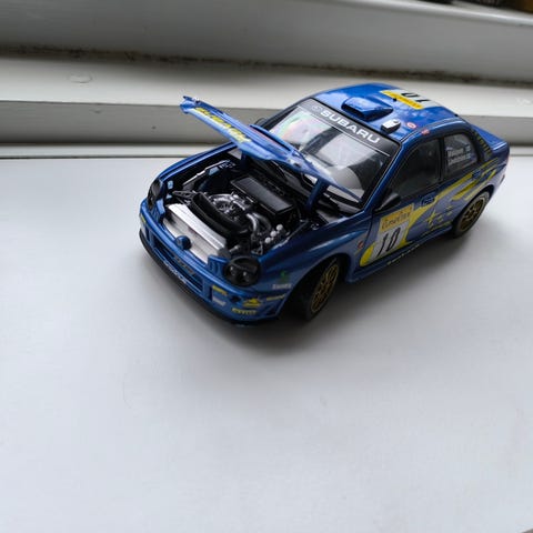 Toyota Corolla WRC modelbil med Castrol rallydekoration. Bilen er udført som racerversion med detaljeret karrosseri, rallybemaling og startnummer 5. Modellen har åbne funktioner som motorhjelm og bagklap, hvor der ses motor og reservehjul i bagagerummet. Der er rullebur i kabinen og realistiske fælge og dæk. Egnede anvendelser kan være som samlerobjekt eller udstillingsmodel. Sjælden modelbil.