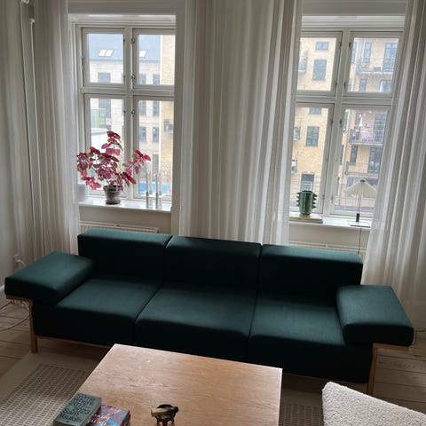 Ældre sofa, utrolig velholdt. God fjedring i puderne, høj komfort. Betræk af uld. Hynderne kan vende på to måder, med røde striber på den ene side. Har aldrig stået i rygerhjem. Sofaen er ellers af træ, den er derfor meget tung så man skal være minimum to ved afhentning.