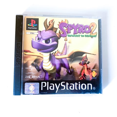 Sony Spyro the Dragon PlayStation spil. Originalt PlayStation (PS1) action- og platformspil i plastcover med for- og bagsidecover. Europæisk PAL-version. Spillet følger figuren Spyro the Dragon i et 3D platformmiljø med flere baner og opgaver. Velegnet til brug på kompatible PlayStation-konsoller, der understøtter PS1 PAL-spil.