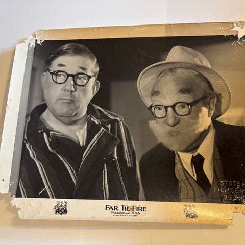 Sort-hvidt udhængsfoto fotografi fra filmen "Far Til Fire Og Onkel Sofus". Billedet viser to personer i en indendørs scene. Nederst på billedet ses filmtitel og produktionsoplysninger trykt på kanten. Velegnet som samlerobjekt eller dekoration for interesserede i klassiske film og fotografi.