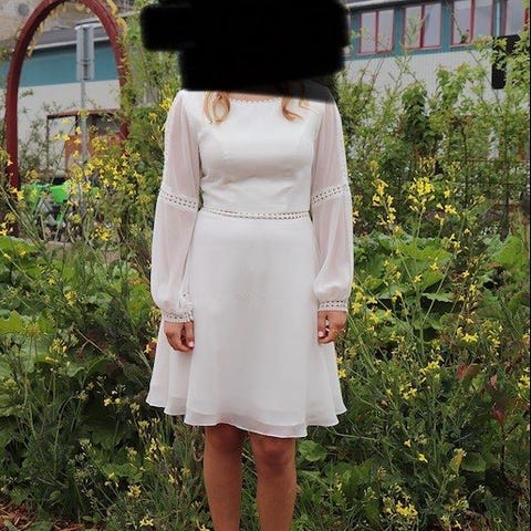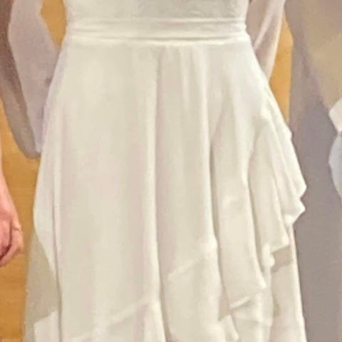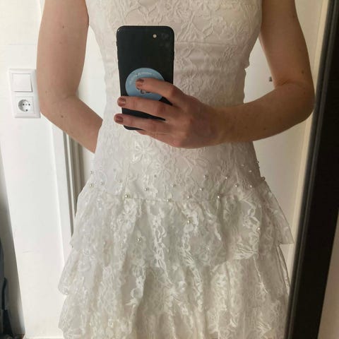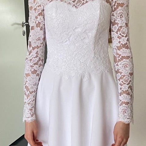 Konfirmationskjole specialdesignet til høj pige, ekstra lang i ærmerne mm. Jeg er cirka 183 høj. Købt hos brudedesign. Har en plet på indersiden af kjolen som man ikke kan se når på, og så en meget lille en på nederdelen af kjolen.