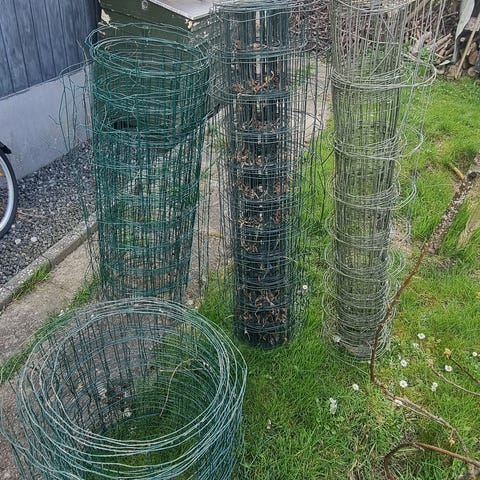 Havehegn i grønmalet metal med tilhørende pæle. Hegnet består af trådnetsektioner, der kan samles til afskærmning eller indhegning i haven. De medfølgende pæle har plastik- eller komposithoveder til fastgørelse af trådnettet. Velegnet til midlertidig eller fast indhegning af mindre områder, fx bede eller mindre dyreindhegninger, afhængigt af højde og længde på sektionerne.