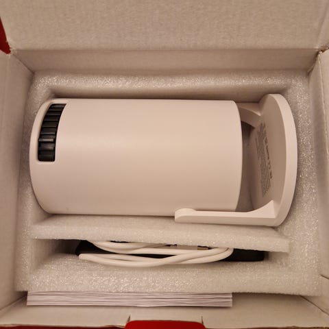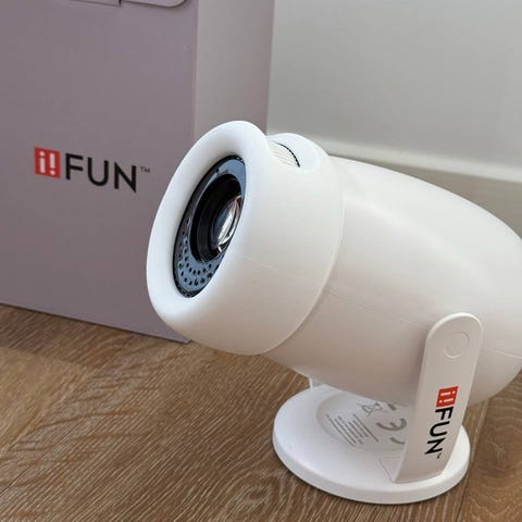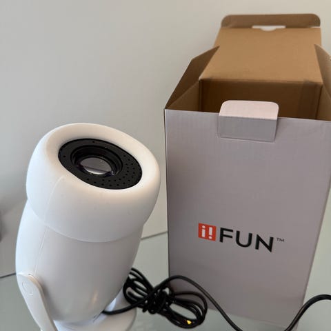 iFUN 230145 mini projektor i hvid. Tilslut via internet, USB eller HD. Fjernbetjening for at lette arbejdet, projektoren arbejder ikke hurtigt i sin startskærm, men har ingen problemer når den skal afspille noget. Fed gave til børneværelset/hobbyisten.