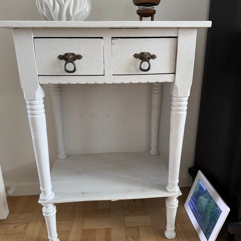 Ukendt mærke konsolbord i mørkt træ med buede ben og en skuffe. Bordpladen har organisk, svunget form og synlig træstruktur. Skuffen er opdelt i flere mindre rum med små trælåger og messingfarvede greb samt nøglehul på fronten. Velegnet som lille sidebord eller konsolbord i entre, stue eller soveværelse.H 73 B 55 D 37 cm.