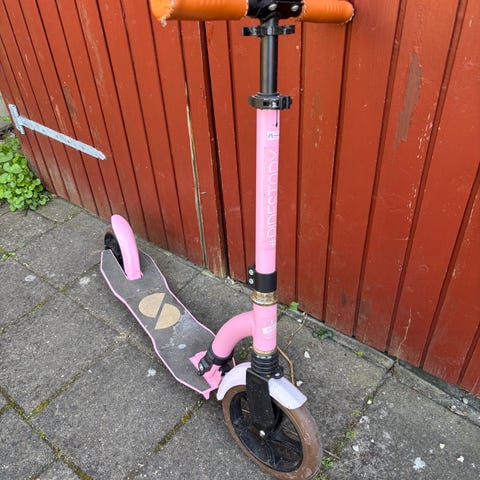 Løbehjul med store hjul og lavt trinbræt. Egnet til kørsel på fortov og cykelsti. Simpelt design med fodbremse på baghjulet og styr med håndtag. Velegnet til daglig transport eller fritidsbrug for børn eller voksne, afhængigt af højde det er lidt rust me det virker