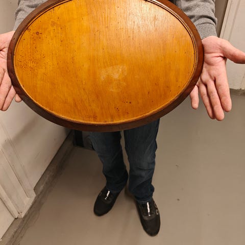 Ovalt spejl med brun træramme i evt. palisander eller mahogni. Tænker, det er ret gammelt/antikt/vintage.