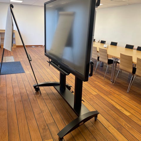 TV-stativ på hjul i hvidlakeret metal. Stativet har justerbare beslag til montering af fladskærms-TV samt integreret strømledning med stik, så TV’et kan tilsluttes direkte på stativet. Udstyret med hjul for nem flytning og stabil fodkonstruktion. Velegnet til brug i stue, mødelokale eller andre rum, hvor TV’et ønskes mobilt placeret. 1 1/2 gammelt.