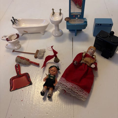 Miniature dukkehus køkken med komfur og køkkengrej. Sættet består af et lille køkkenelement med overskab, åbne hylder, skuffer og komfur med kogeplader og ovn. Medfølgende tilbehør omfatter små gryder, pander og køkkenredskaber i miniaturestørrelse. Egnet til brug i dukkehuse eller som samlerobjekt i miniaturemiljøer.