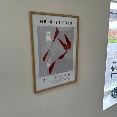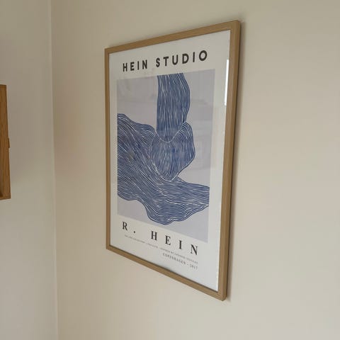 Hein Studio plakat med abstrakt motiv i blå og hvid inkl ramme. På overfladen af rammen er der en mindre ridse.