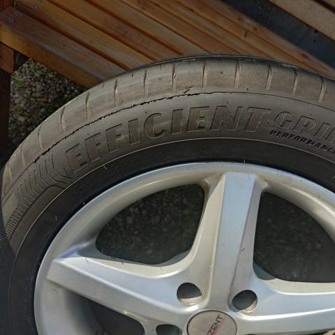 Aluminum rim in very good condition. One cap is missing. Tires need replacing, they are very bad. made in Germany