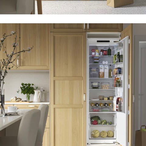 IKEA FASTNÄS køleskab i hvid. Indbygningskøleskab med hylder og grøntsagsskuffer samt dørhylder til opbevaring af flasker og mindre varer. Velegnet til montering under bordplade. Mål 59,5 bredde og 82 højde